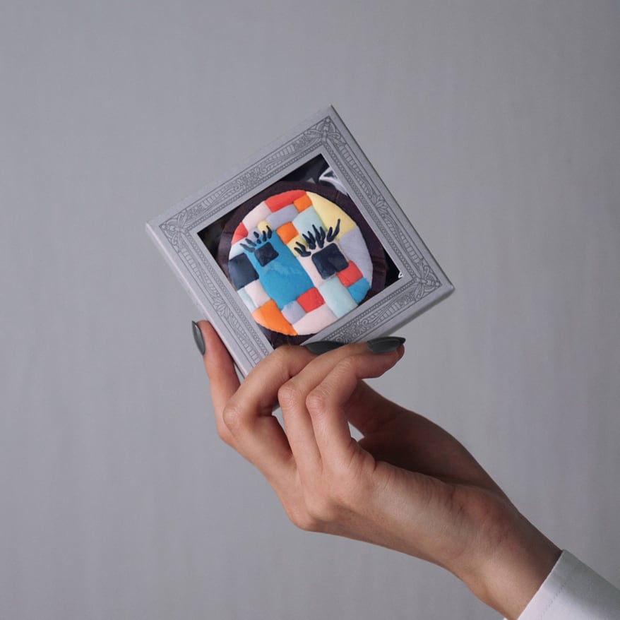 中〜後期の作品に見られる鮮やかな色彩と、特徴的な四角形の構成を表現しました。額縁模様の化粧箱に入れてお届けいたします。